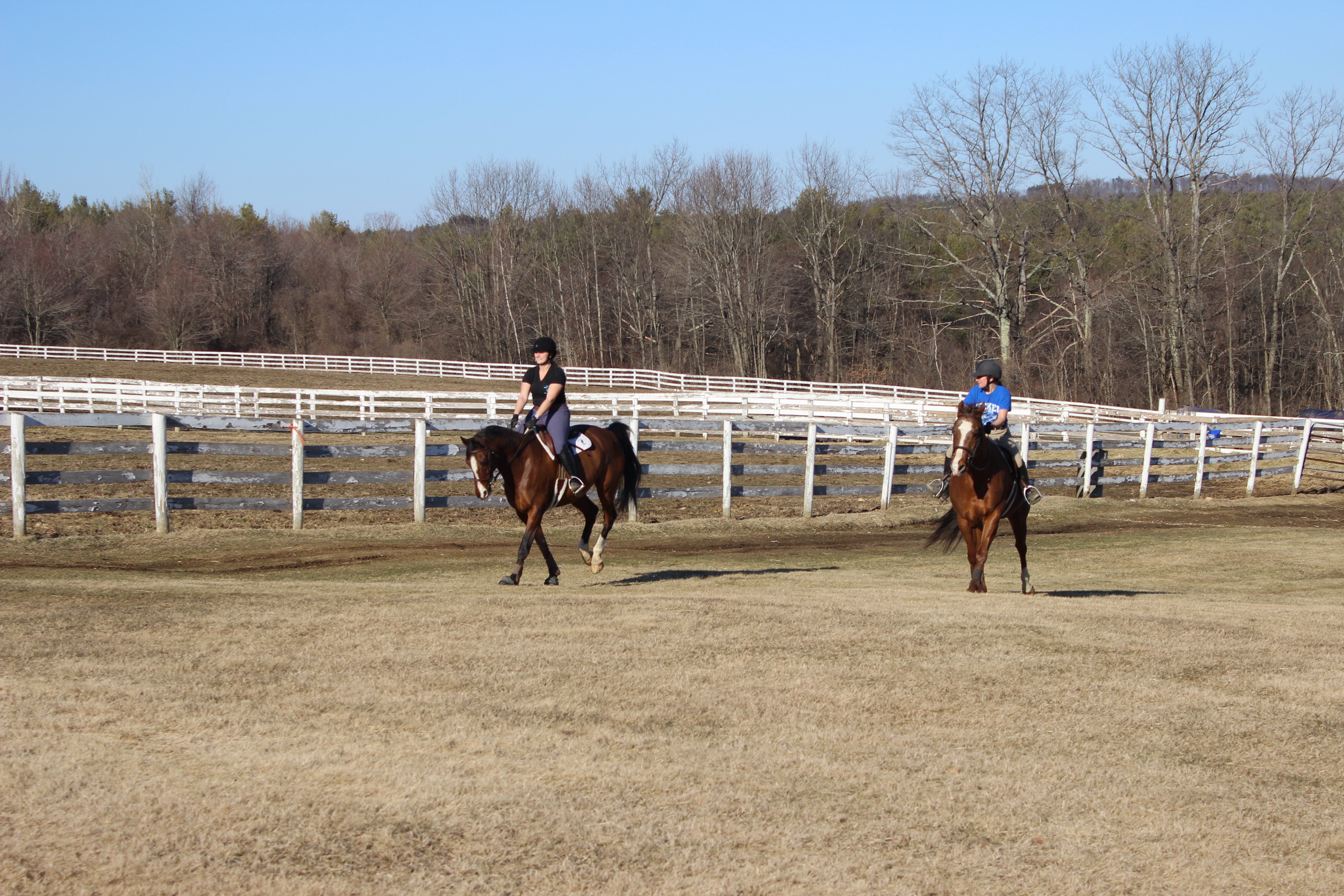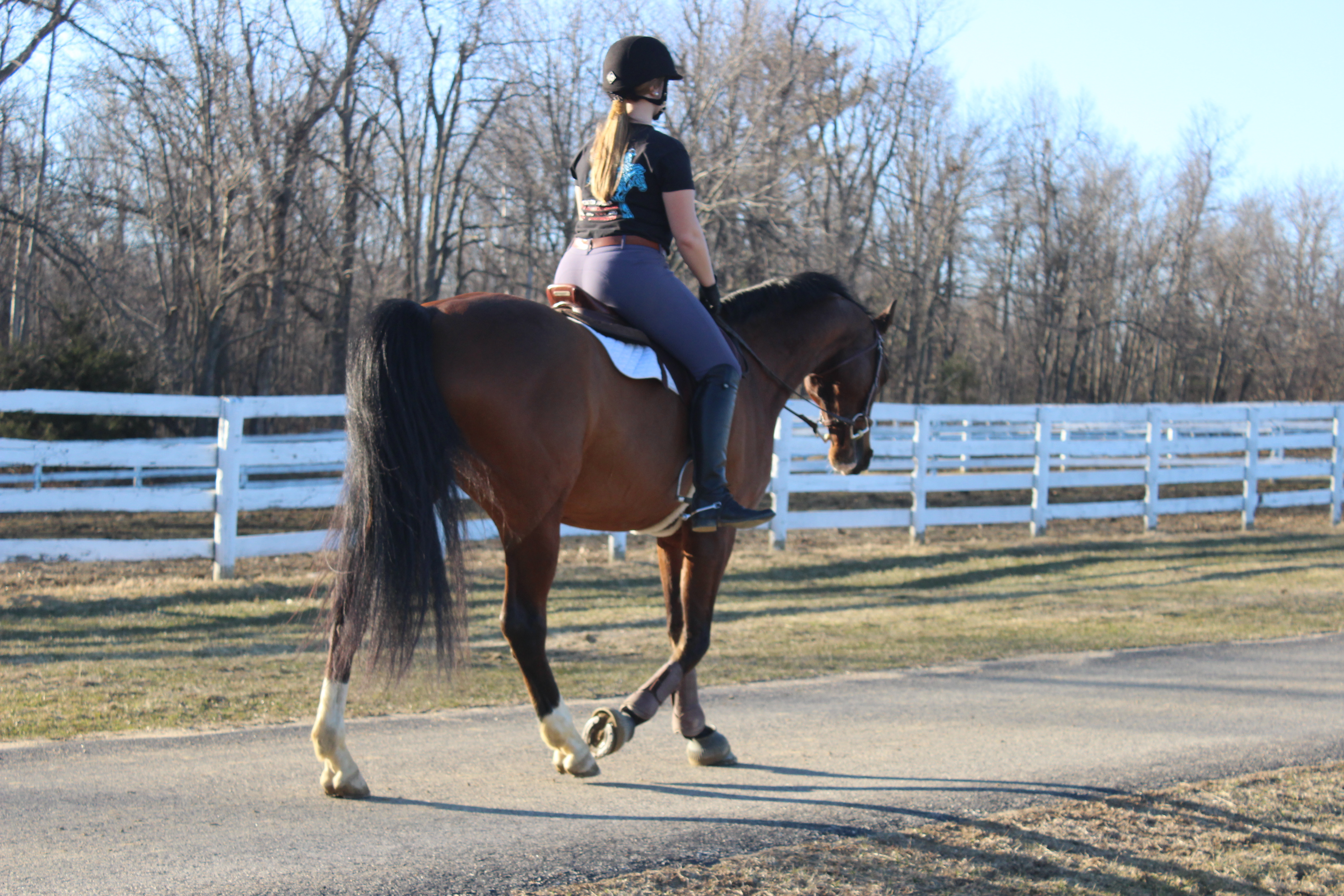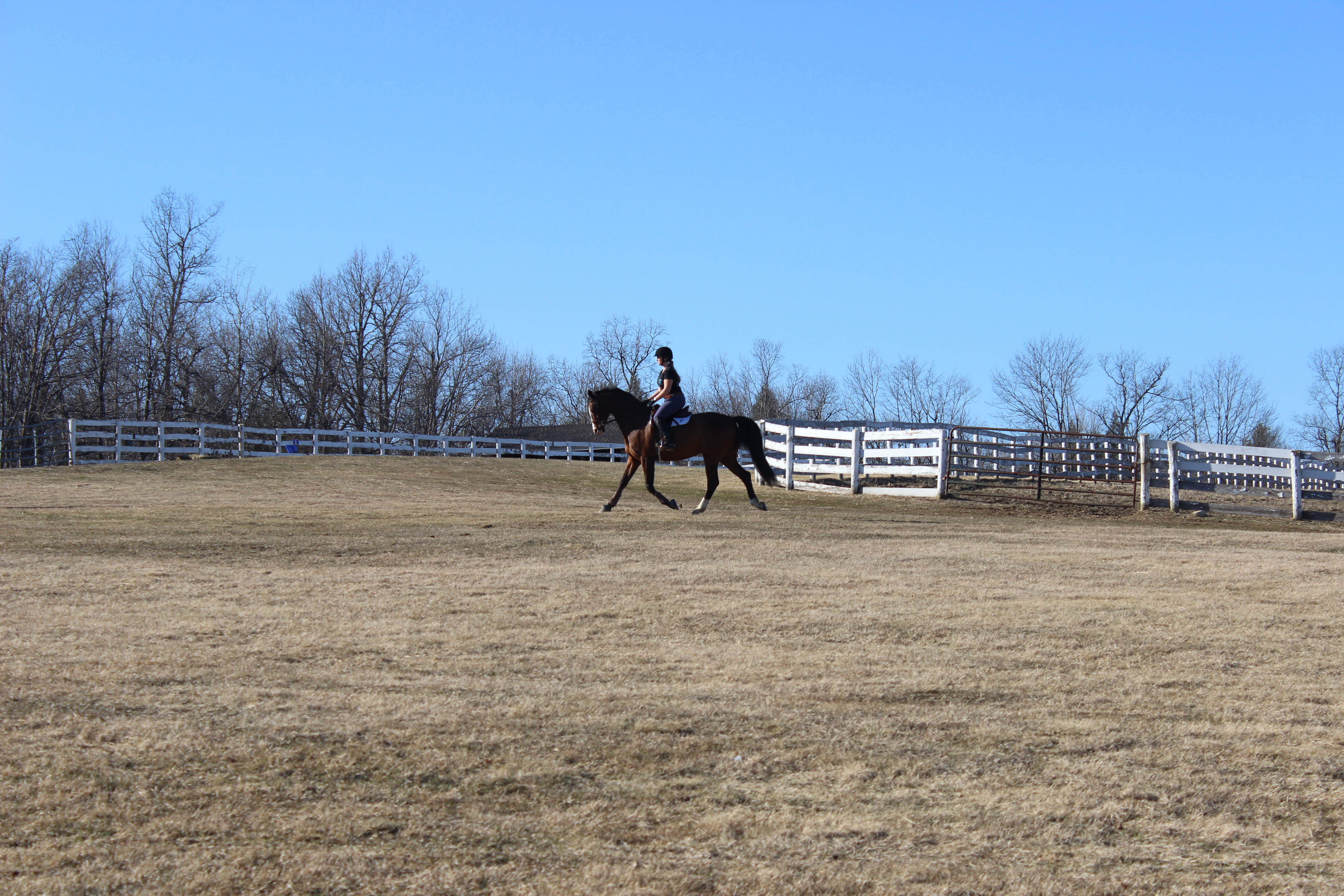 I was pleasantly surprised when I stepped outside in a sweatshirt only for it to be warm enough for a t-shirt. Never had I been more excited about changing into a short sleeved shirt. What I shouldn’t have been surprised about was getting to the barn and finding Axcent absolutely caked in mud, but I was. After about an hour of choking on dirt, I gave up on trying to get the beast dirt-free and settled for mildly clean. So I tacked up and headed to the outdoor with Kirby, another BCET rider who boards her horse, Tally, at the Becker barn.