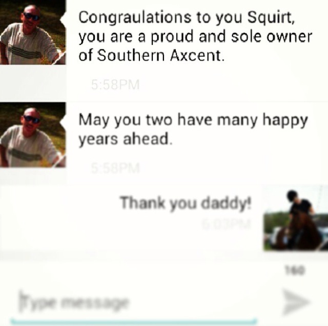A year ago today I got the best text ever from my father, AXCENT WAS OFFICIALLY MINE! I had been away at school for about a week and had left my dad with a check for his owner and a date, time, and place to meet her and sign the papers. That week of school felt like pure torture. I was either going to have Ax as my own, or I was never going to see him again. Lucky for me, all the crossing of my fingers paid off because on Thursday, August 15, 2013 at 5:58 PM Southern Axcent became mine.